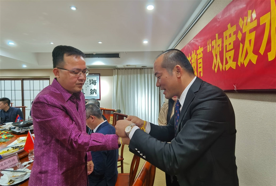 (老撾駐南寧總領(lǐng)事館總領(lǐng)事維拉薩宋蓬先生為致公黨廣西區(qū)委秘書長兼辦公室主任李永政先生栓線禮節(jié))