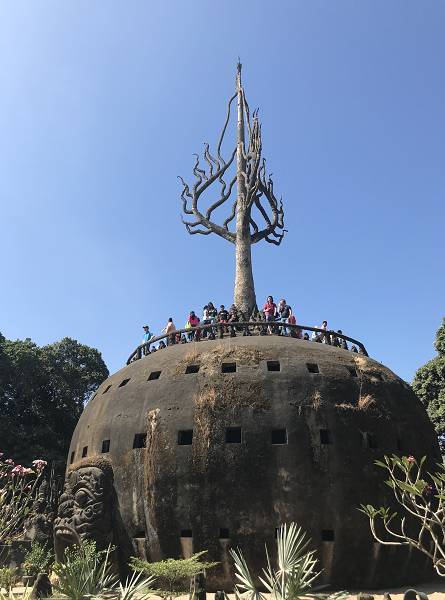 香昆寺里有一座球形的塔,與河對岸廊開(泰國)的萬橋公園遙相呼應(yīng),這便是著名的“天堂地獄塔”。每個(gè)來這里的人都要進(jìn)去走一走,體驗(yàn)從“從地獄到天堂”的過程。