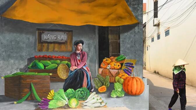 褚舍村以安全蔬菜種植業(yè)聞名,因此15幅大型壁畫重現(xiàn)了當(dāng)?shù)剞r(nóng)民的日常生活畫面,從各種農(nóng)作物、蔬菜、果園,壁畫中一個(gè)純農(nóng)業(yè)小村的畫面給參觀者帶來(lái)一種自然和美麗的視覺(jué)效果。