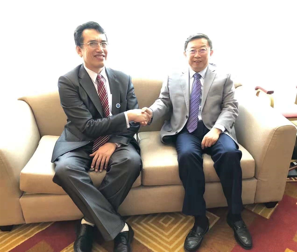 2018年9月,中國—東盟商務(wù)理事會執(zhí)行理事長許寧寧與老撾科技部副部長交談。
