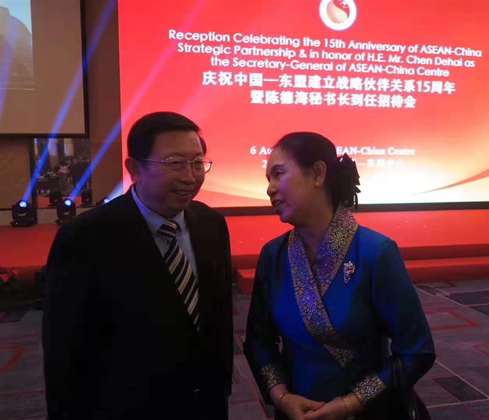 2018年8月,在中國—東盟建立戰(zhàn)略伙伴關(guān)系15周年招待會上,許寧寧與老撾駐華大使交談。
