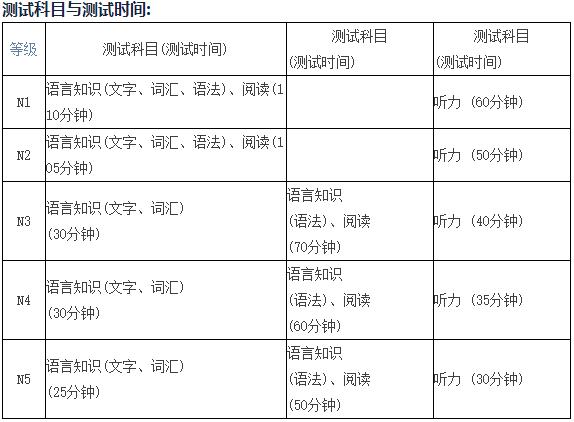 N3、N4、N5考試分"語(yǔ)言知識(shí)(文字、詞匯)";"語(yǔ)言知識(shí)(語(yǔ)法)、閱讀"及"聽(tīng)力"3個(gè)科目,滿(mǎn)分均為180分。